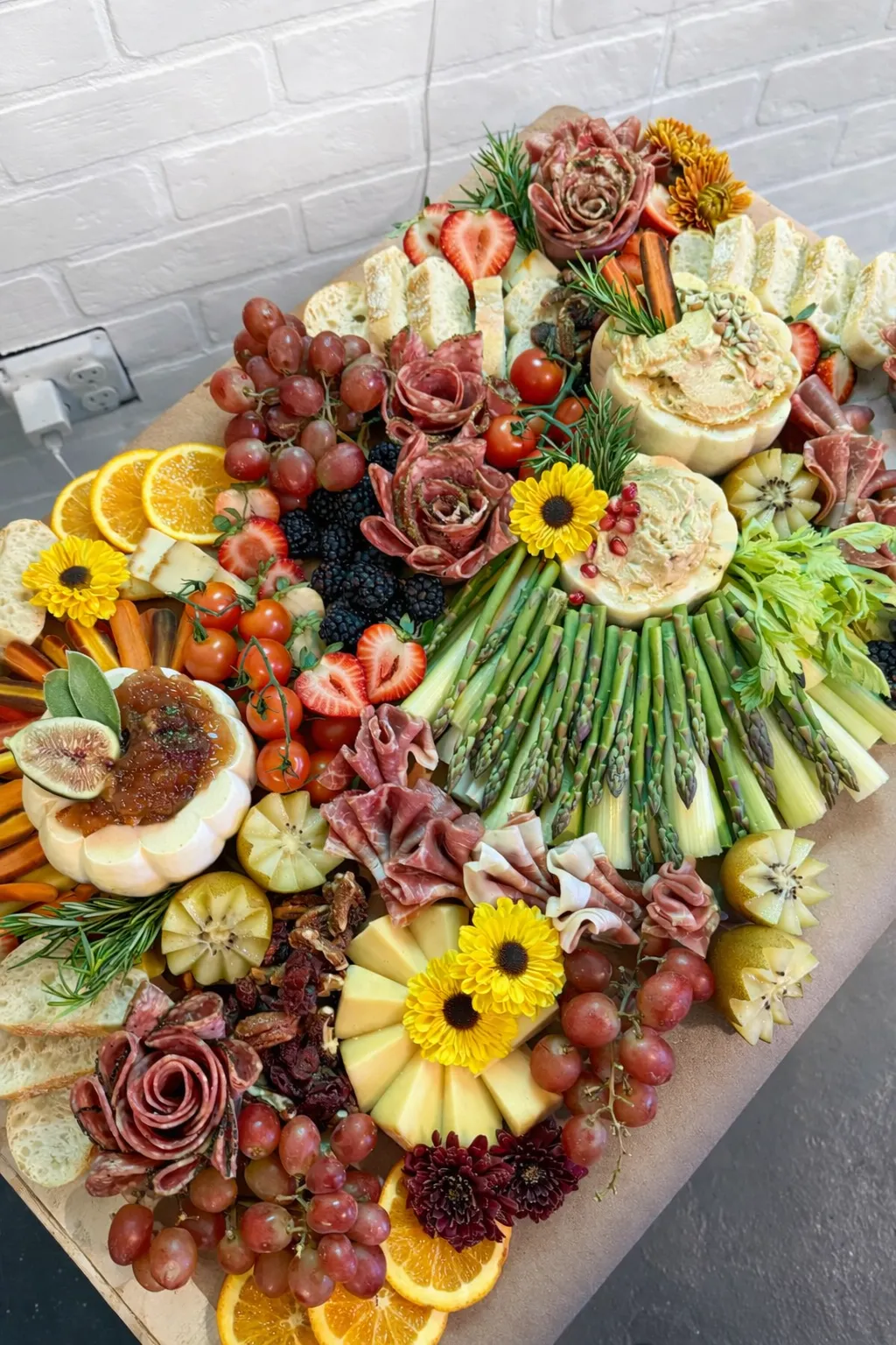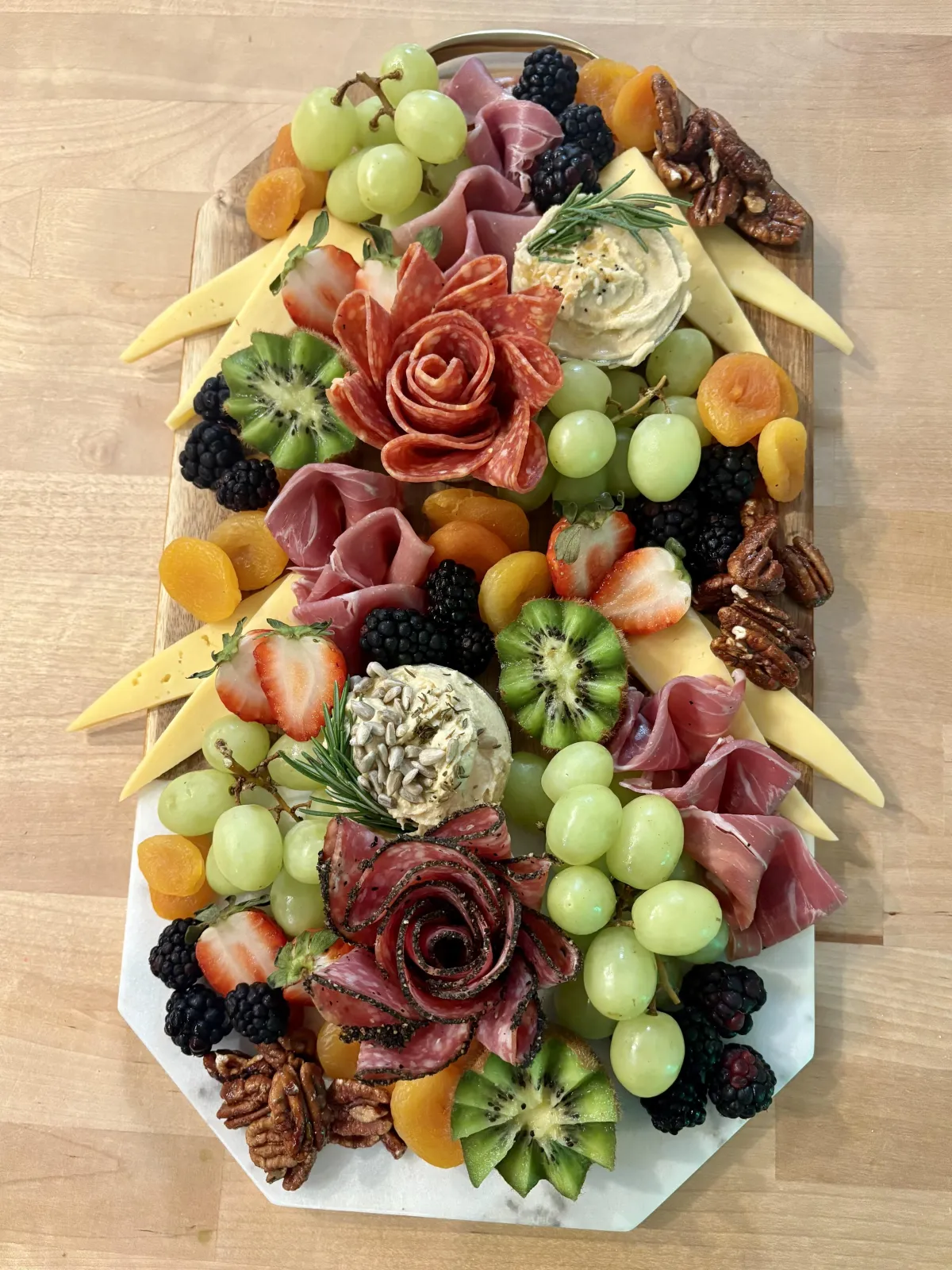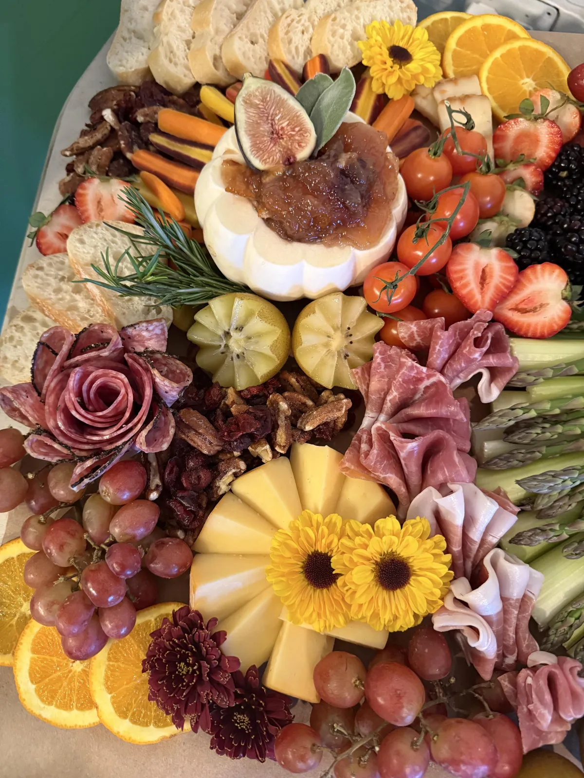 Carefully curated selection of cheeses, cured meats, fruits, accompaniments & artisanal elements